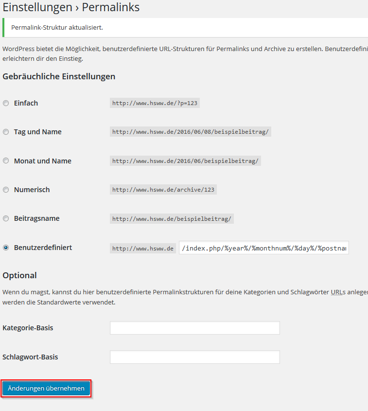 Dieses Fehlverhalten sieht nach einem Problem mit eurer Permalink Struktur aus. Solltet ihr diese bisher gar nicht beachtet haben oder bereits richtig eingestellt haben, so hilft ein einfaches Änderungen übernehmen um diese neu zu berechnen und der Fehler ist bereits behoben. Solltet ihr euch noch nicht um die Permalink Struktur gekümmert haben, so lohnt es sich zu diesem Thema zu recherchieren und im Sinne der Suchmaschinen Optimierung (SEO) anzupassen.